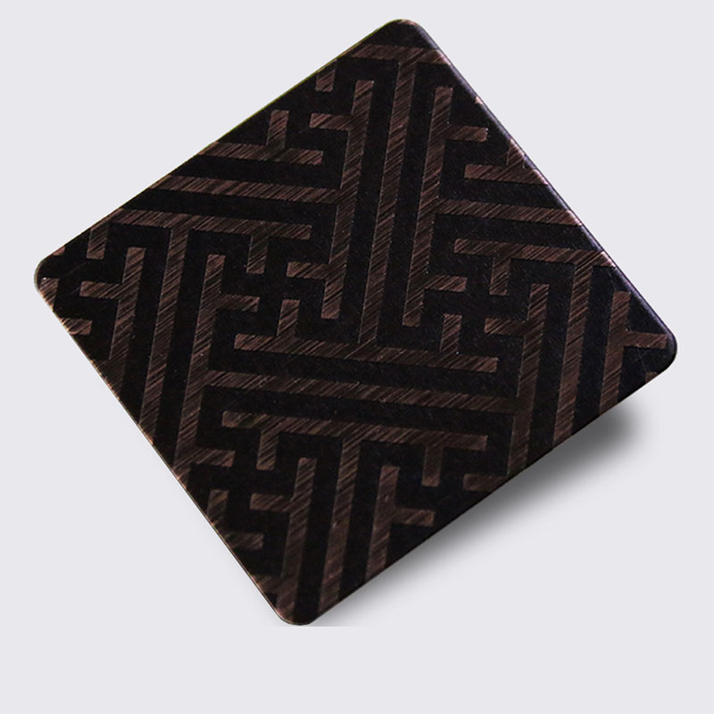 不銹鋼蝕刻板是在不銹鋼表面通過化學(xué)的方法,腐蝕出各種花紋圖案。以8K鏡面板、拉絲板、噴砂板為底板,進(jìn)行蝕刻處理后,對物體表面再進(jìn)行深加工,不銹鋼蝕刻板可進(jìn)行局部的和紋,拉絲,嵌金,局部鈦金等各式復(fù)雜工藝處理,不銹鋼蝕刻板實(shí)現(xiàn)圖案明暗相間,色彩絢麗的效果。